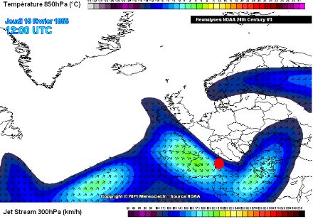 Le rianalisi dei modelli di previsione ci consentono oggi di tornare indietro nel tempo e ricalcolare alcuni campi meteorologici dell'epoca. In questo caso, ecco cosa si ottiene per il 15 febbraio 1855 alle 12 UTC, ovvero circa 12 ore prima del naufragio: