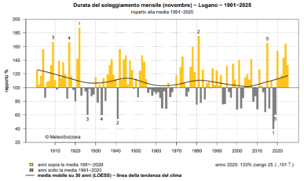 Così come nel precedente mese di ottobre, anche in novembre a sud delle Alpi la durata del soleggiamento è risultata ben superiore alla media del periodo di riferimento 1991-2020, con valori compresi fra il 130 e il 140 % della media pluriennale, sebbene non da primato. Per le stazioni di Acquarossa / Comprovasco, Stabio e Poschiavo / Robbia si è trattato dell’ottavo mese di novembre più soleggiato a partire dall’inizio delle misure, avvenuto rispettivamente nel 1976, 1981 e 1979. Per San Bernardino (inizio misure nel 1969) si è trattato del nono mese di novembre più soleggiato, per Magadino / Cadenazzo e Cimetta (inizio misure nel 1979 e nel 1982) del decimo. Con 140,1 ore di sole, per Lugano si è trattato del venticinquesimo mese di novembre più soleggiato dal 1885.
